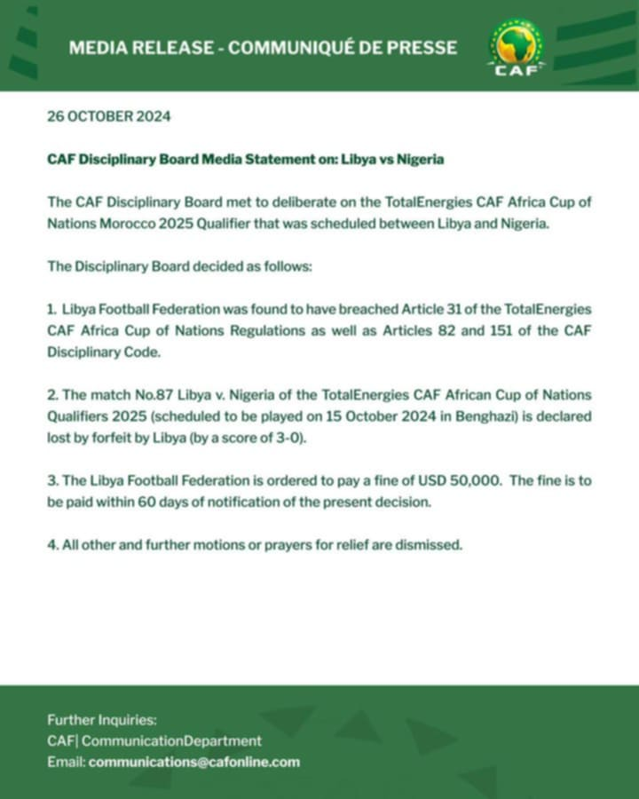 قرر المجلس التأديبي في الاتحاد الإفريقي لكرة القدم خسارة ليبيا أمام نيجيريا بنتيجة 3 - 0 ضمن تصفيات أمم إفريقيا 2025.