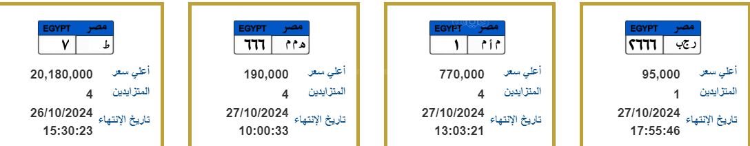 كما طرحت اللوحة المعدنية " ر ج ب 2666" بسعر 95 ألف جنيه، لوحة معدنية " م أ م 1 " بسعر 770 ألف جنيه، لوحة معدنية " ه م م 666" بسعر 190 ألف جنيه، " ه م م 666" بسعر 190 الف جنيه ويتنافس عليها 4 أشخاص.