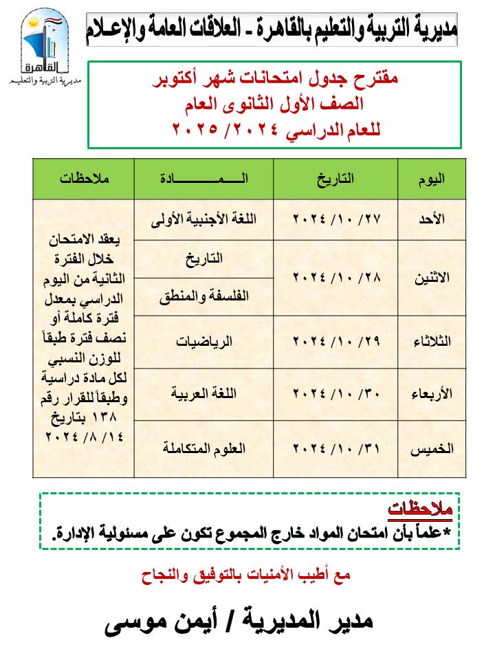أما بالنسبة لأعمال امتحانات شهر أكتوبر للعام الدراسي ٢٠٢٤/ ٢٠٢٥ للصفين الأول والثاني الثانوي العام، أشارت الوزارة إلى أنه في ضوء ما جاء بالقرار الوزاري رقم (۱۳۸) لسنة ٢٠٢٤ بشأن نظام الدراسة والتقييم لطلاب مرحلة الثانوي العام، فإنه يتعين على كافة المديريات والإدارات التعليمية والمدارس الالتزام بإعداد امتحانات شهر أكتوبر للصفين الأول والثانى الثانوى العام على مستوى الإدارة التعليمية من خلال موجه أول المادة وفقًا للكتاب الدوري رقم (٤٩) بتاريخ ۲۱/ ۱۱/ ۲۰۲۲.