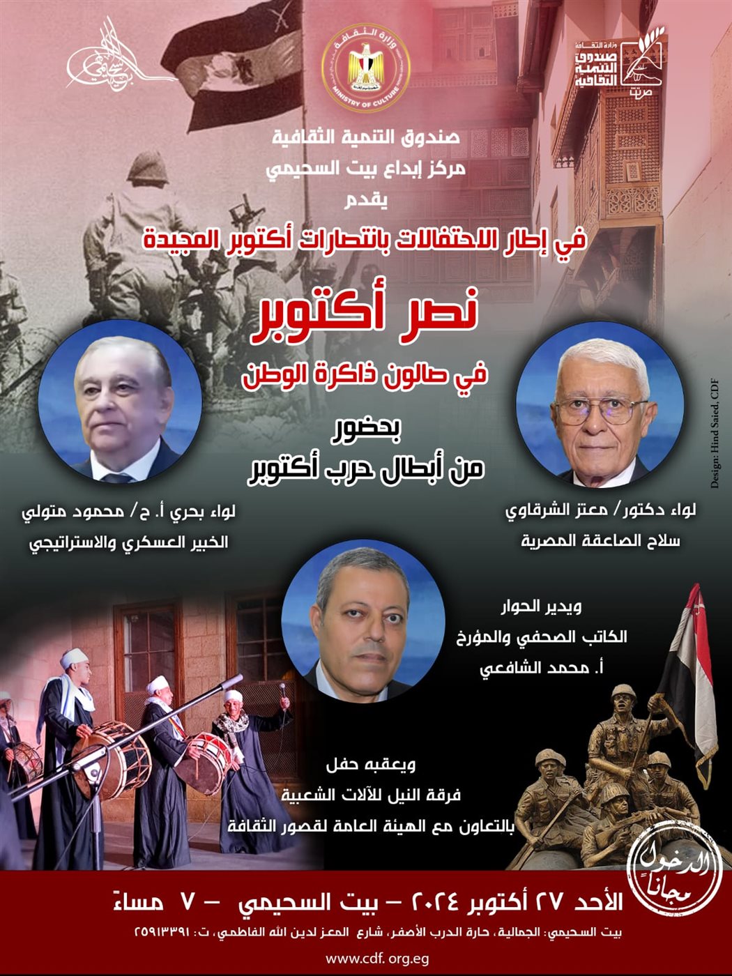 يقدم مركز إبداع بيت السحيمي بشارع المعز - التابع لقطاع صندوق التنمية الثقافية برئاسة المعماري حمدي السطوحي - أمسية جديدة من أمسيات صالون "ذاكرة الوطن"، اليوم الموافق الأحد 27 أكتوبر في تمام الساعة السابعة مساءً.