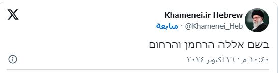 رسالة جاءت مع إطلاق المرشد الإيراني علي خامنئي، مساء السبت، حسابه عبر منصة «إكس» (تويتر سابقا) باللغة العبرية، قال فيها: «بسم الله الرحمن الرحيم».