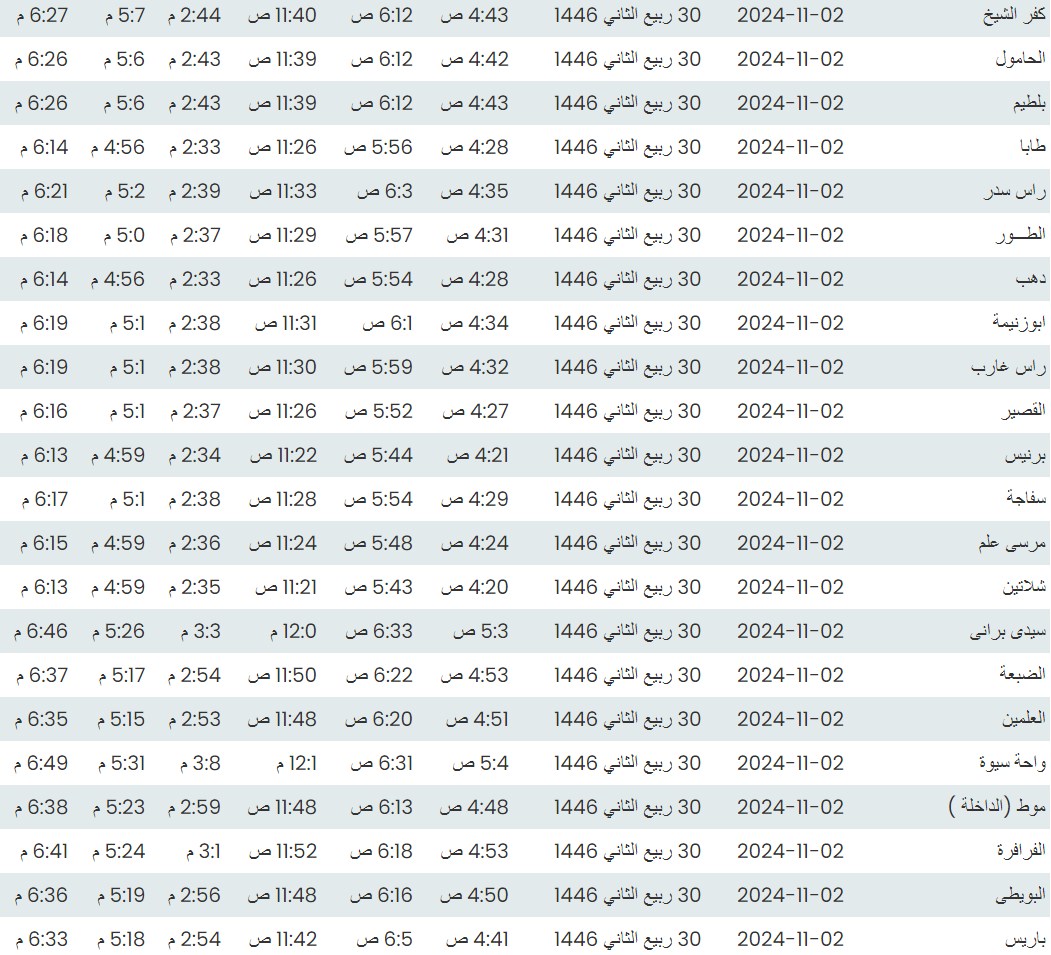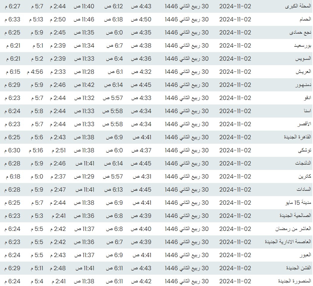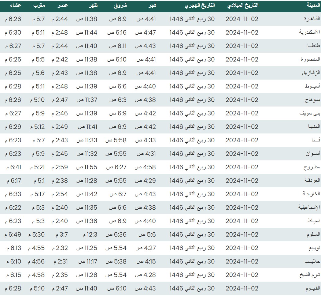وفيما يلي مواقيت الصلاة، لعدد من مدن ومحافظات الجمهورية من واقع بيانات الهيئة العامة للمساحة