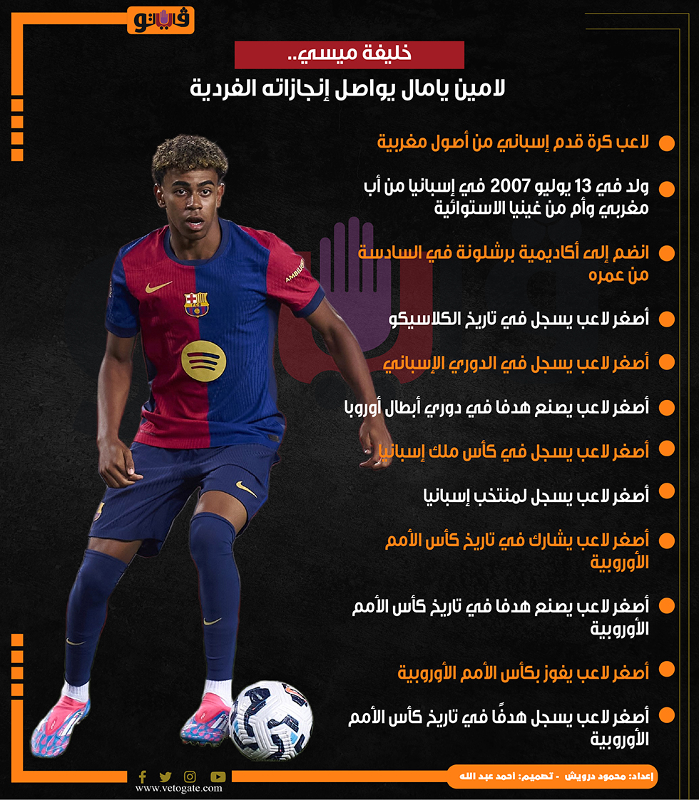 خليفة ميسي.. لامين يامال يواصل إنجازاته الفردية (إنفوجراف) الإثنين 28/أكتوبر/2024 - 12:00 م 10/28/2024 12:00:20 PM لامين يامال محمود درويش شارك طباعة 18 حجم الخط شارك طباعة لامين يامال منتخب اسبانيا كأس الأمم الأوروبية الكلاسيكو برشلونة ميسي