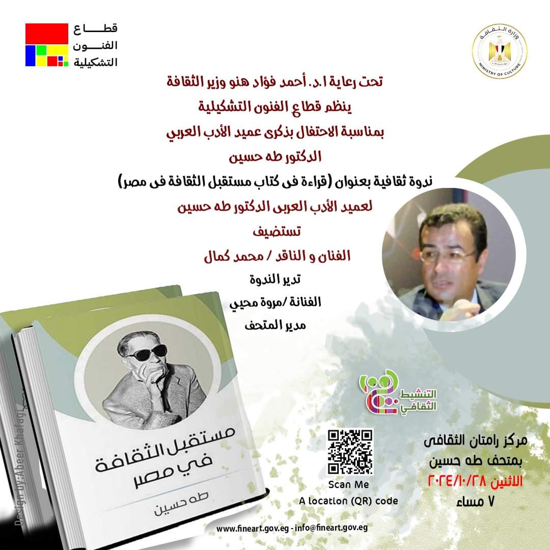أعلن قطاع الفنون التشكيلية برئاسة الدكتور وليد قانوش عن تنظيم مركز رامتان الثقافي بمتحف طه حسين ندوة ثقافية بعنوان "قراءة في كتاب مستقبل الثقافة في مصر" تحت إشراف الإدارة العامة للتنشيط الثقافي وذلك يوم الاثنين الموافق 28 أكتوبر في تمام الساعة الـ 7 مساءً بمناسبة الاحتفال بذكرى عميد الأدب العربي الدكتور طه حسين.