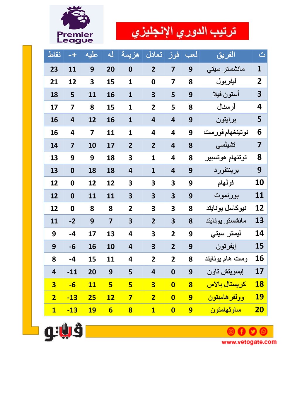 ويحتل ليفربول المركز الثاني بـ21 نقطة، يليه أستون فيلا بـ18 نقطة، ثم آرسنال بـ17 نقطة.