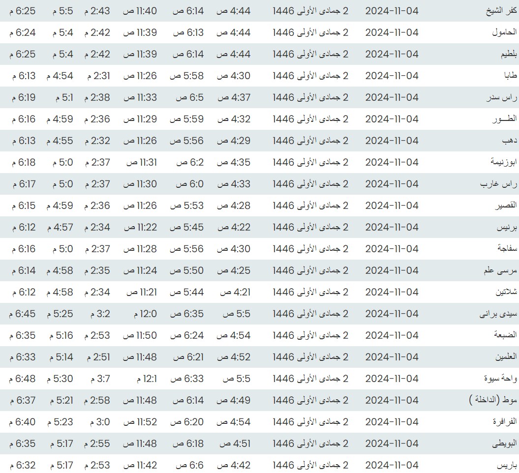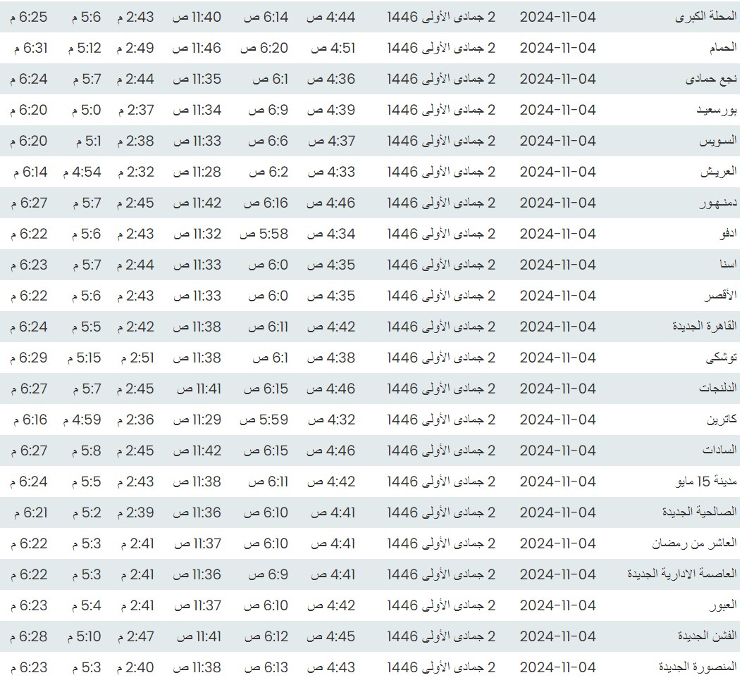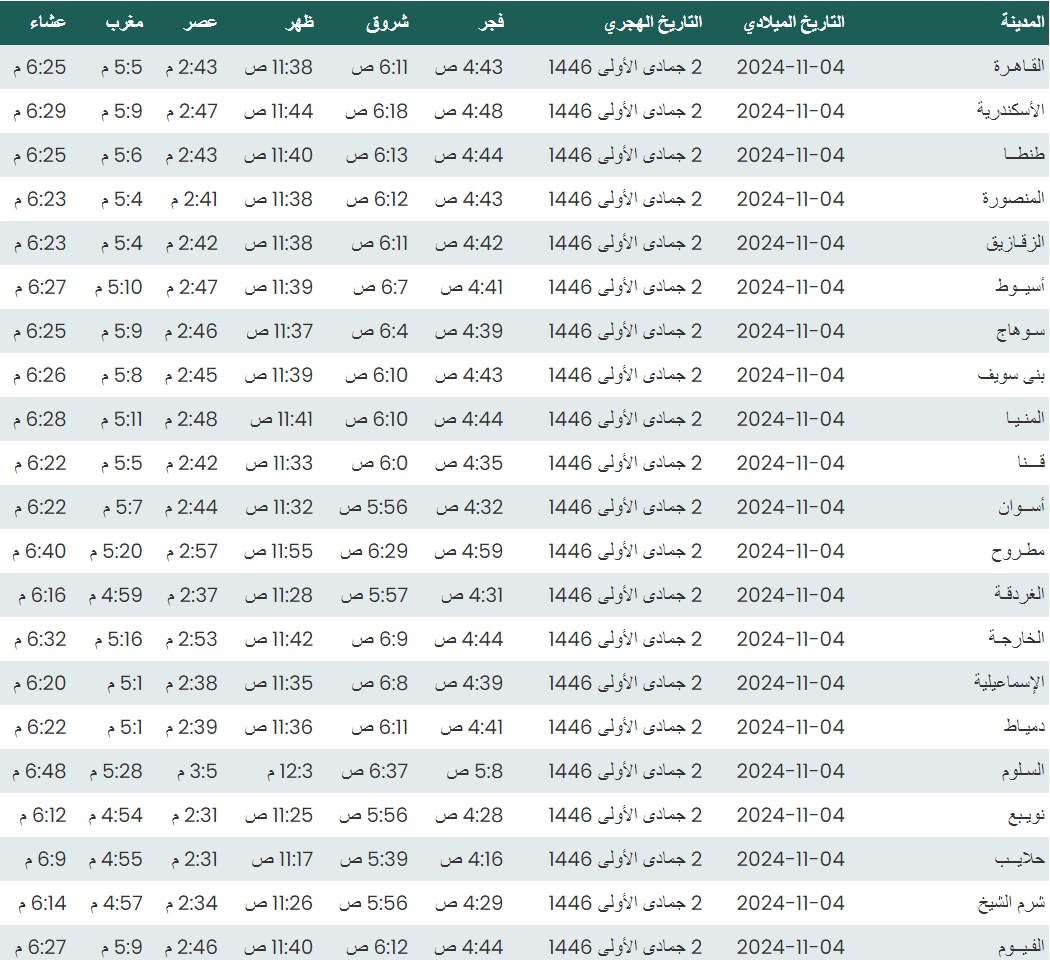 وفيما يلي مواقيت الصلاة، لعدد من مدن ومحافظات الجمهورية من واقع بيانات الهيئة العامة للمساحة