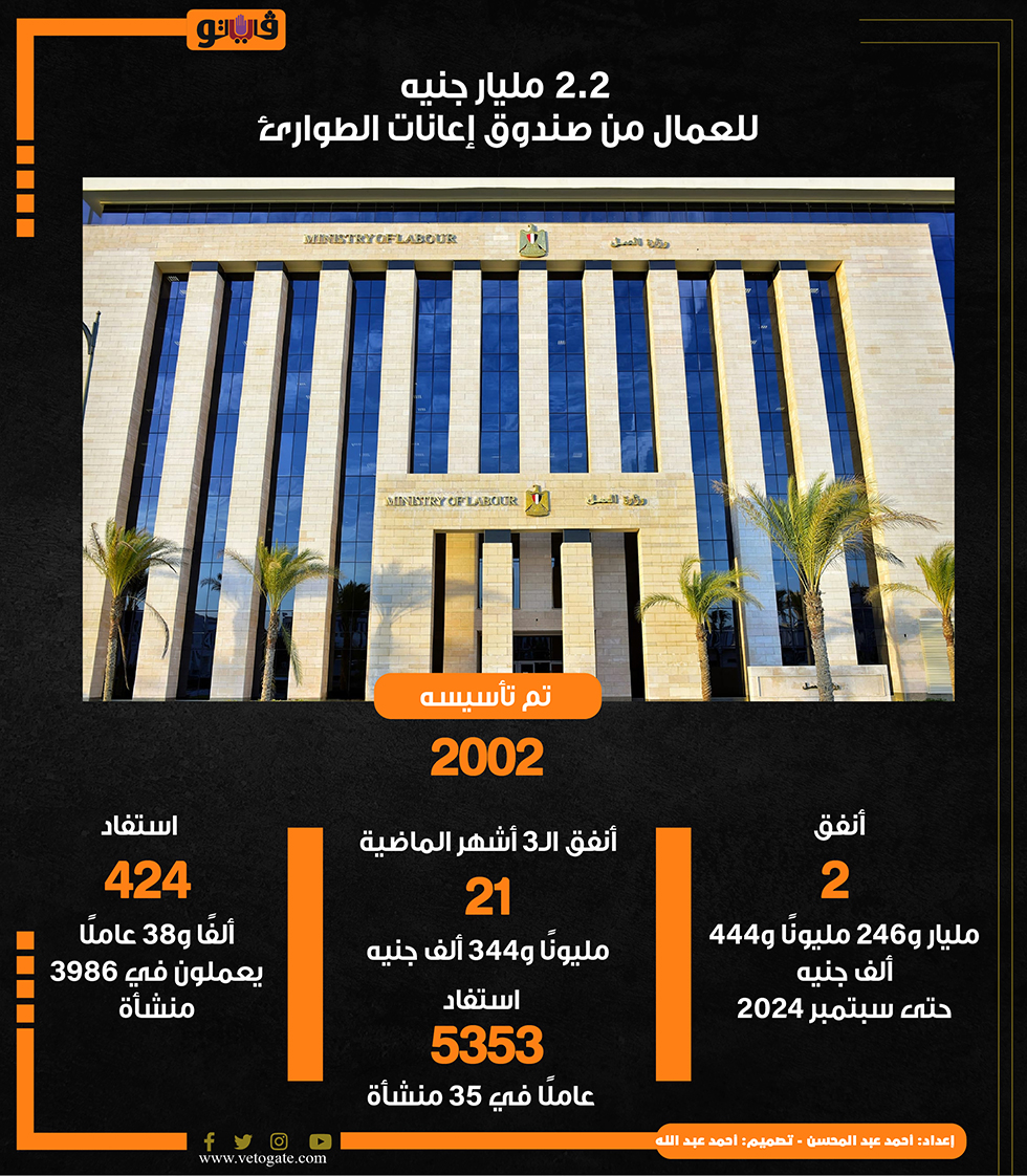2.2 مليار جنيه للعمال من صندوق إعانات الطوارئ (إنفوجراف) الإثنين 04/نوفمبر/2024 - 12:15 م 11/4/2024 12:15:03 PM وزارة العمل، فيتو أحمد عبدالمحسن شارك طباعة 18 حجم الخط شارك طباعة صندوق إعانات الطوارئ إعانات الطوارئ سبتمبر 2024 اعانات