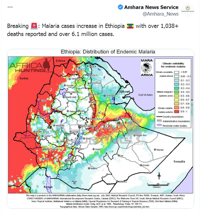 وأعلن موقع أخبار الأمهرة في تقرير له "عن ارتفاع حالات الإصابة بالملاريا في إثيوبيا.. مع الإبلاغ عن أكثر من 1038 حالة وفاة وأكثر من 6.1 مليون حالة."