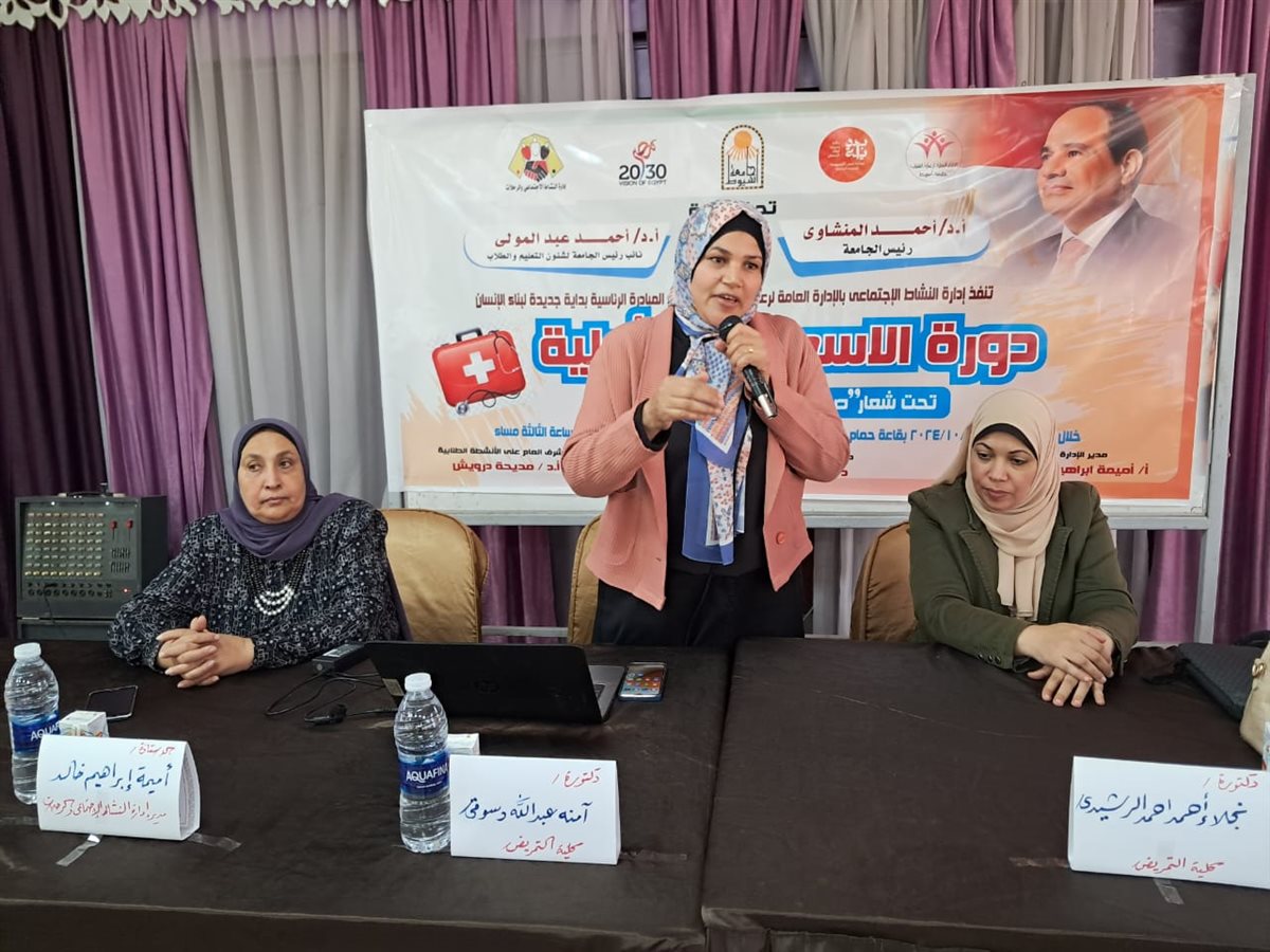 نظمت إدارة النشاط الاجتماعي والرحلات، بالإدارة العامة لرعاية الطلاب بجامعة أسيوط ؛ دورة الإسعافات الأولية ل (250) طالبًا، وطالبة على مستوى كليات الجامعة، في ضوء المبادرة الرئاسية؛ بداية جديدة؛ لبناء الإنسان، وتحت شعار:(صحتك أمانة فحافظ عليها) ذلك تحت رعاية الدكتور أحمد المنشاوي رئيس جامعة أسيوط.