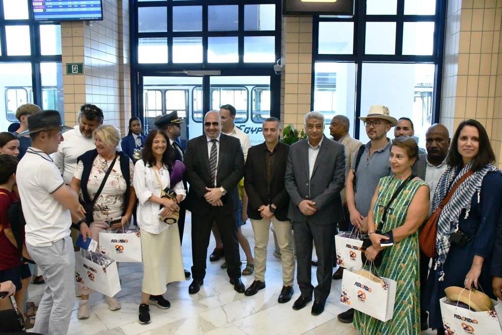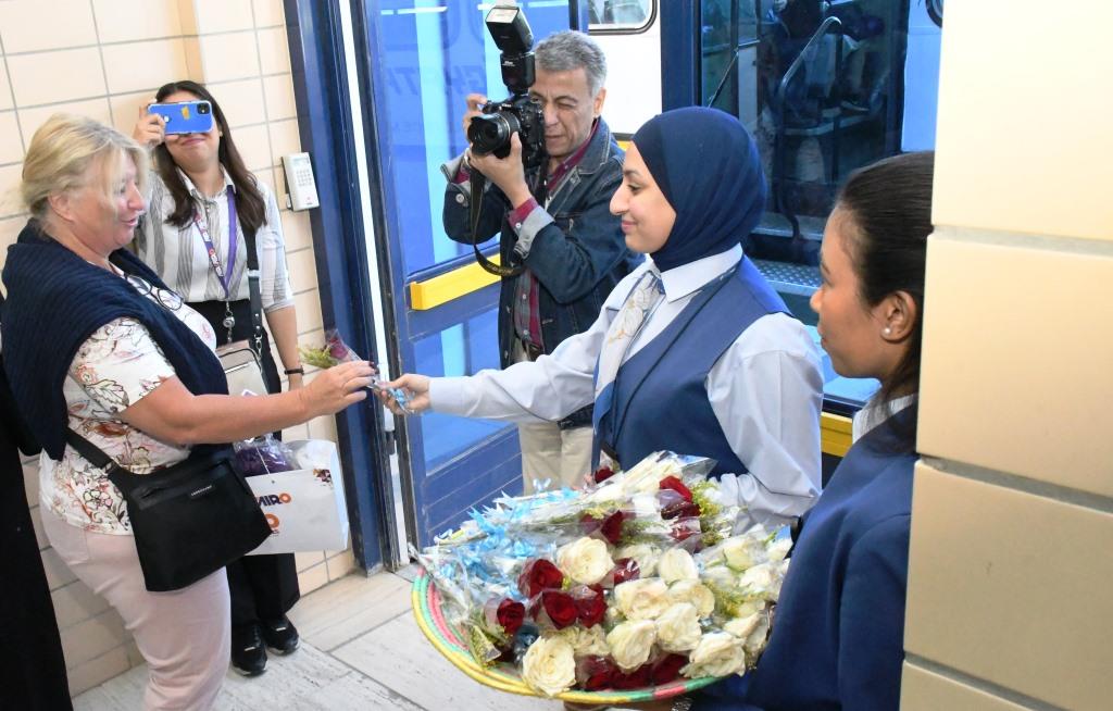 وجاء ذلك بحضور اللواء أحمد الباز مدير مطار أسوان الدولى، والطيار أحمد شنن رئيس الشركة، بالورود والهدايا التذكارية.