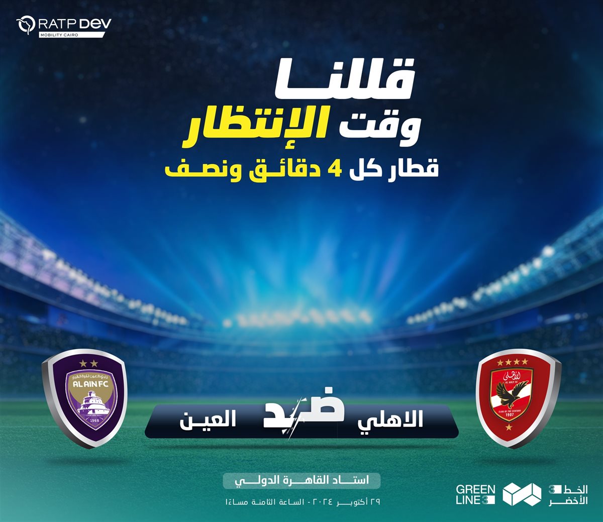 وكتبت شركة آر إيه تي بي ديف عبر صفحتها الرسمية على موقع التواصل الاجتماعي بـ فيسبوك، منشورًا جاء فيه: يوم الثلاثاء 29 أكتوبر في استاد القاهرة الدولي، النادي الأهلي هيلعب ضد نادي العين الاماراتي، تقدر تركب الخط الأخضر الثالث وتوصل لمحطة الإستاد في أسرع وقت علشان تلحق المباراة، هيتوفر قطار كل 4 دقائق ونصف ابتداءً من الساعة 2 مساءً حتى الساعة 7 مساءً وكمان بعد المباراة من 10 مساءً حتى 12 ونصف صباحًا.