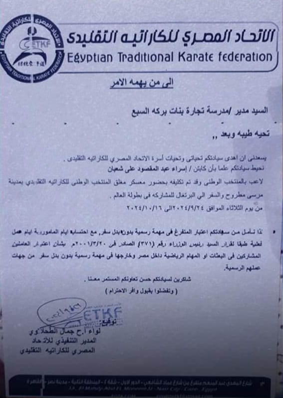 السيد مدير مدرسة تجارة بنات بركة السبع، يسعدني أن أهدي سيادتكم تحياتي وتحيات أسرة الاتحاد المصري للكاراتيه التقليدي، ونحيط سيادتكم علمًا بأن كابتن/ إسراء عبد المقصود علي شعبان، لاعب بالمنتخب الوطني، تم تكليفها بحضور معسكر مغلق المنتخب الوطني للكاراتيه التقليدي، بمدينة مرسى مطروح، والسفر إلى البرتغال للمشاركة في بطولة العالم، من يوم الثلاثاء الموافق ۲۰۲٤/٩/٢٤، إلى ٢٠٢٤/١٠/١٦.