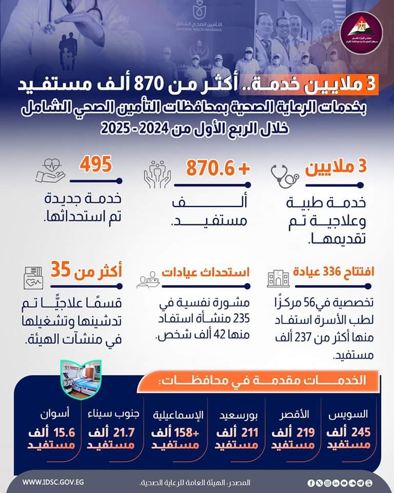 نشرت الصفحة الرسمية لـ مركز المعلومات ودعم اتخاذ القرار بمجلس الوزراء، على موقع التواصل الاجتماعي فيسبوك إنفوجرافًا جديدًا تحت عنوان (خدمات الرعاية الصحية بمحافظات التأمين الصحي الشامل خلال الربع الأول من 2024-2025).