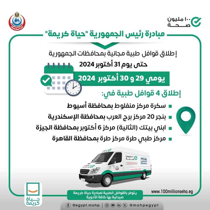 أعلنت وزارة الصحة إطلاق ٤ قوافل طبية ضمن مبادرة رئيس الجمهورية حياة كريمة يومي ٢٩ و٣٠ أكتوبر للكشف والعلاج مجانًا في التخصصات الطبية نساء وولادة - خدمات تنظيم الأسرة - الأطفال والباطنة - الأنف والأذن والعظام - الجراحة - الرمد الأسنان - القلب - الجلدية وخدمات الأشعة والتحاليل.