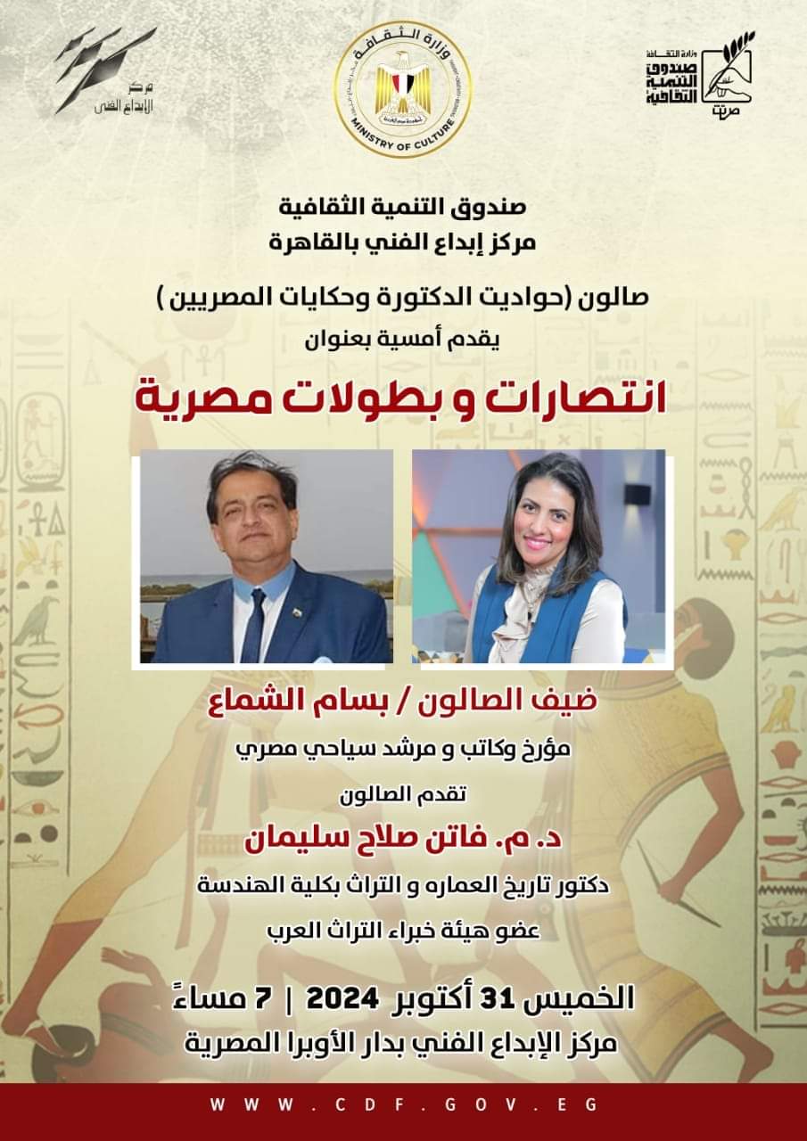 يستضيف صالون (حواديت الدكتورة.. وحكايات المصريين) المؤرخ الدكتور "بسام الشماع" وأمسية ثقافية بعنوان "انتصارات وبطولات مصرية" وذلك بمركز الإبداع الفني -ساحة دار الأوبرا - التابع لقطاع صندوق التنمية الثقافية، في السابعة مساء الخميس 31 أكتوبر.
