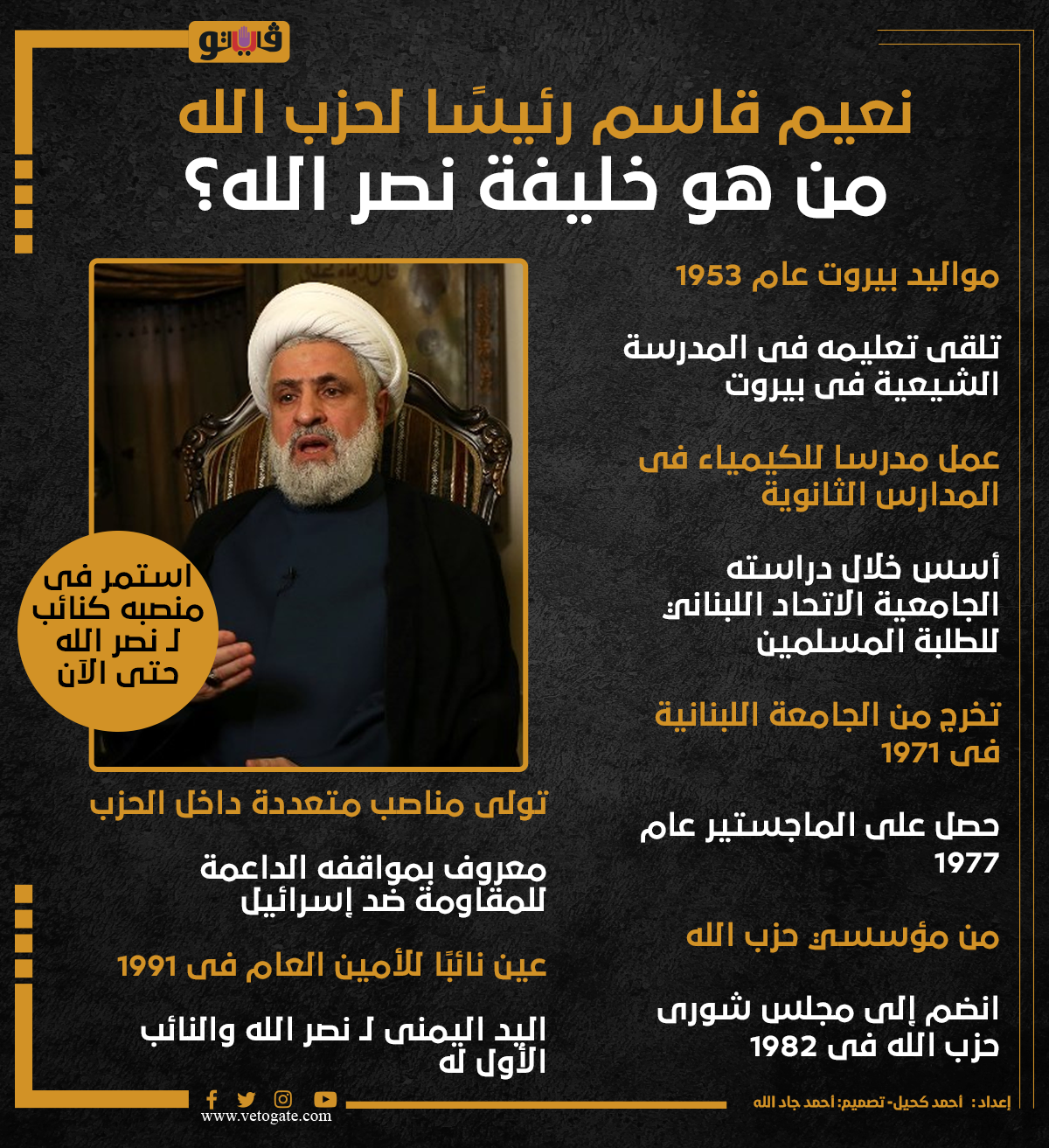نعيم قاسم رئيسًا لحزب الله، من هو خليفة نصر الله؟ (إنفوجراف) الثلاثاء 29/أكتوبر/2024 - 01:23 م 10/29/2024 1:23:47 PM نعيم قاسم الأمين العام لحزب الله، فيتو أحمد كحيل شارك طباعة 18 حجم الخط شارك طباعة نعيم قاسم أمين حزب الله الجديد خليفة نصر الله حسن نصر الله