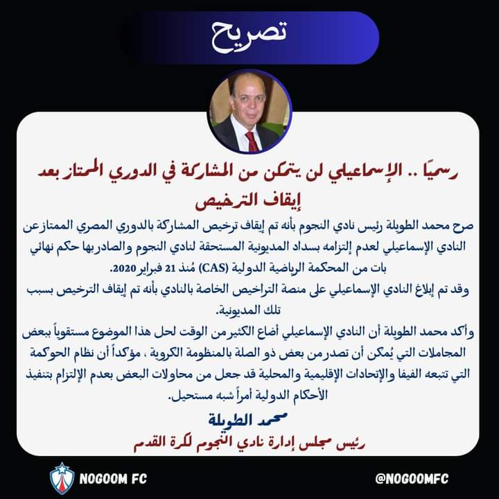 وقال محمد الطويلة، في بيان رسمي تم نشره على حساب نادي النجوم في فيسبوك:" تم إخطار الإسماعيلي بعدم حصوله على الرخصة الرسمية لخوض منافسات الدوري المصري عبر منصة معتمدة من الاتحاد الأفريقي "كاف".