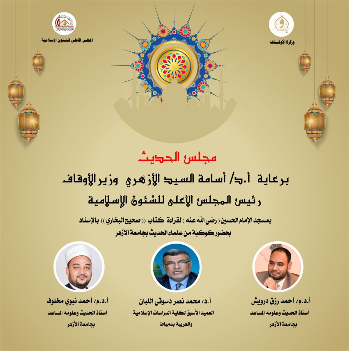تواصل وزارة الأوقاف المصرية والمجلس الأعلى للشؤون الإسلامية اليوم الأربعاء الموافق 2024/10/30م المجلس الحديثي الخامس لقراءة كتاب صحيح الإمام البخاري (رحمه الله) بالإسناد من مسجد الإمام الحسين (رضي الله عنه) عقب صلاة العصر.