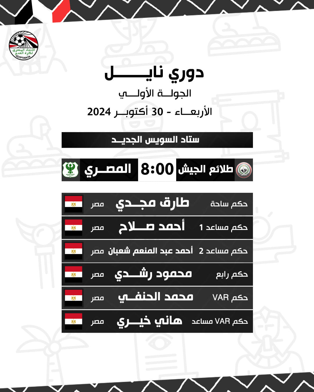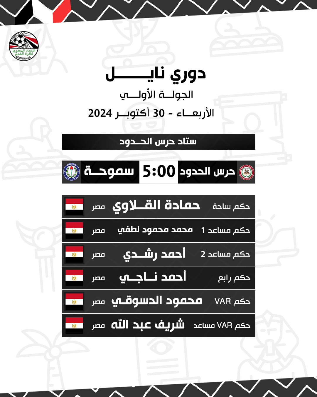 الدوري الممتاز، أعلنت لجنة الحكام الرئيسية باتحاد الكرة المصري، أسماء حكام مباراتي غد الأربعاء في الجولة الافتتاحية من مسابقة الدوري الممتاز.