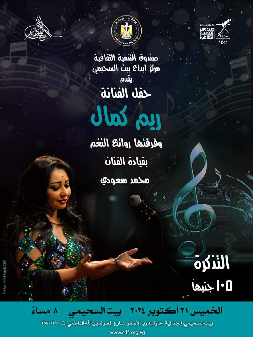 يستضيف مركز إبداع بيت السحيمي -بشارع المعز- التابع لقطاع صندوق التنمية الثقافية، حفل جديد للفنانة ريم كمال وفرقتها روائع النغم بقيادة الفنان محمد سعودي في الثامنة مساء الخميس الموافق 31 أكتوبر.