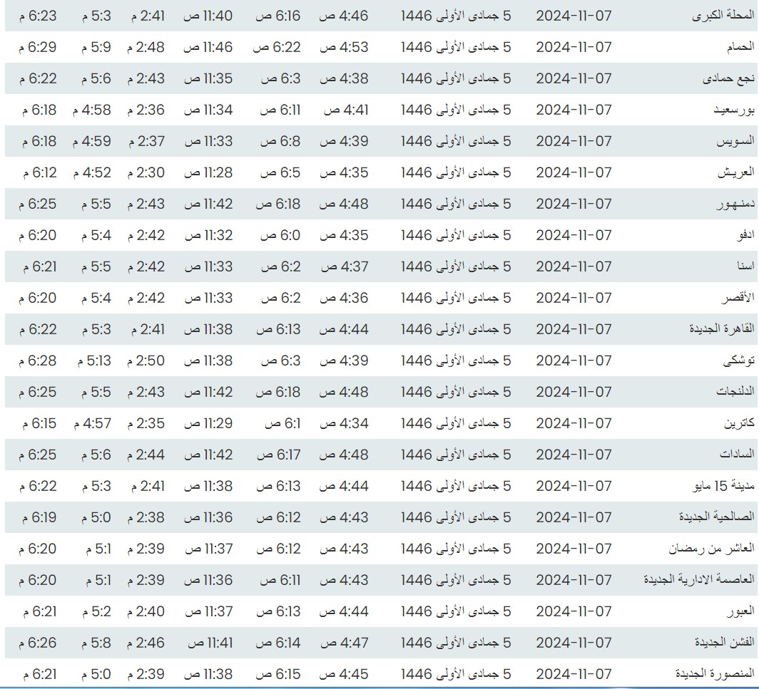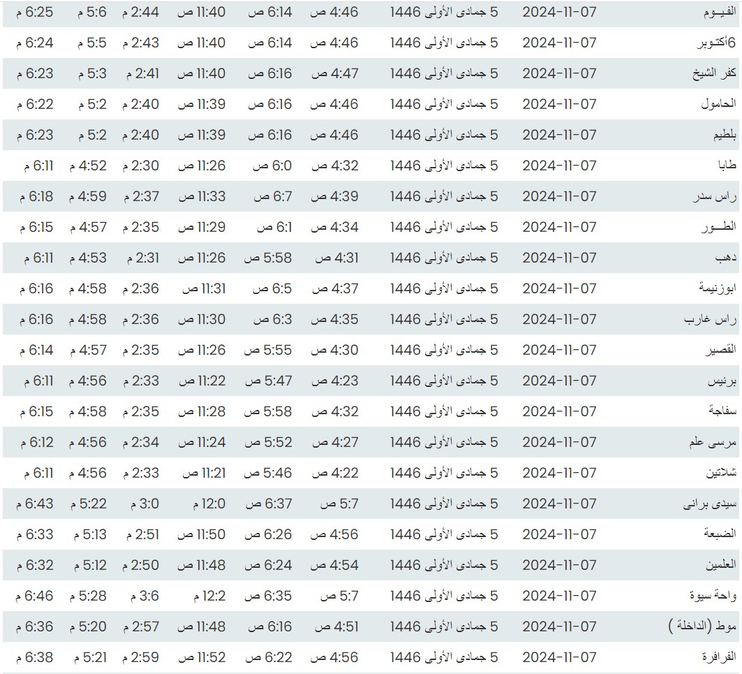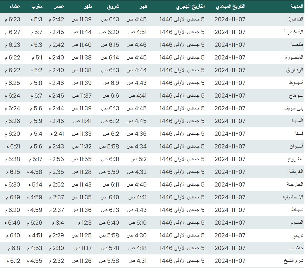 وفيما يلي مواقيت الصلاة، لعدد من مدن ومحافظات الجمهورية من واقع بيانات الهيئة العامة للمساحة