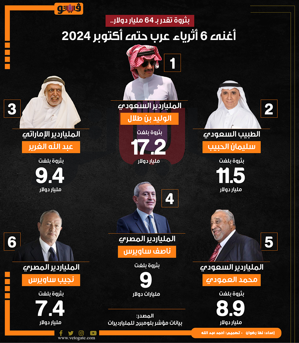 بثروة تقدر بـ 64 مليار دولار.. أغنى 6 أثرياء عرب حتى أكتوبر 2024 (إنفوجراف) الأربعاء 30/أكتوبر/2024 - 08:33 م 10/30/2024 8:33:14 PM أغنياء العرب، فيتو نها رضوان شارك طباعة 18 حجم الخط شارك طباعة الملياردير الإماراتي الوليد بن طلال مؤشر بلومبرج للمليارديرات مؤشر بلومبرج ناصف ساويرس نجيب ساويرس قائمة أغنياء العرب قائمة اثرياء العرب