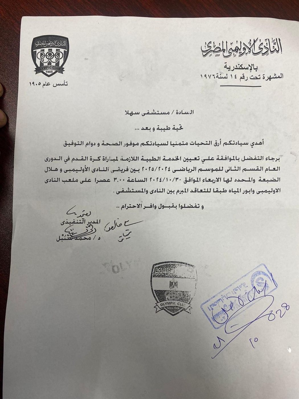 وعلي صعيد متصل، انتشر خطاب يفيد بطلب النادي الأولمبي من احدي المستشفيات توفير الهدمة الطبية اللازمة لمباراة الفريق أمام منافسه الهلال وفقا للاتفاق المبرم بين النادي السكندري والمستشفي.