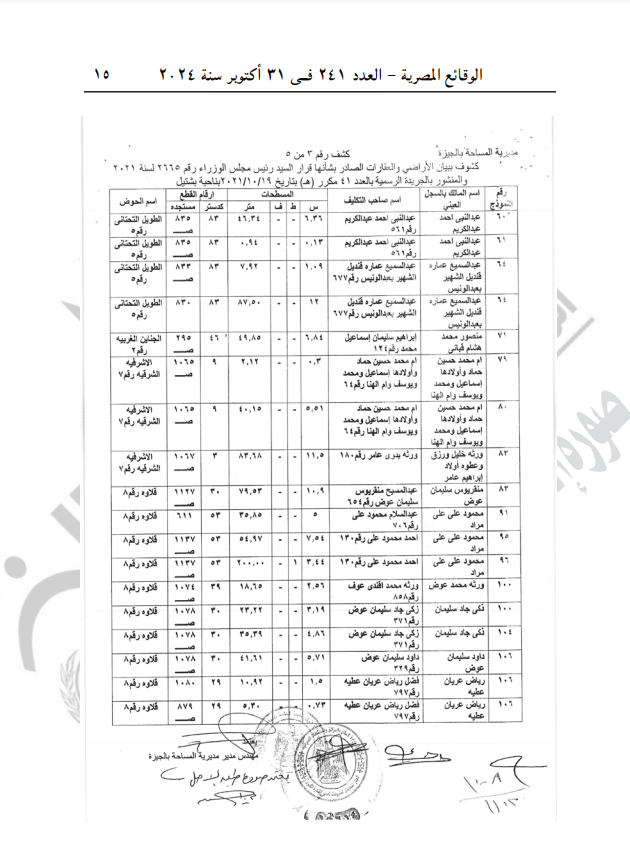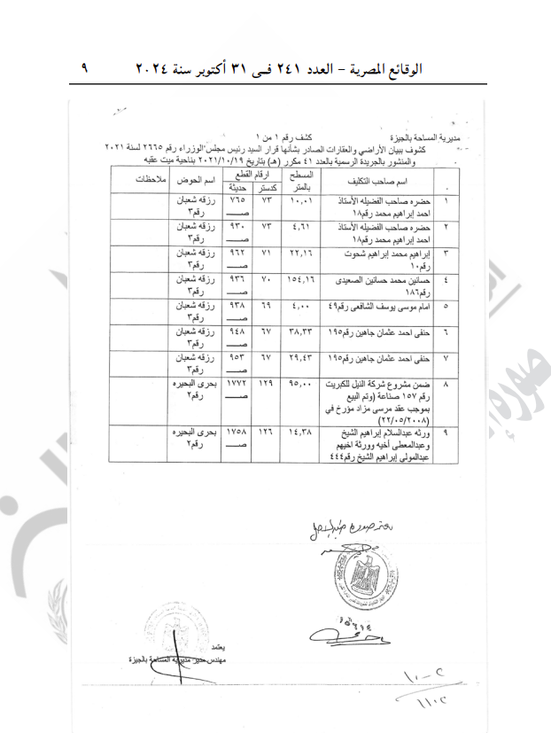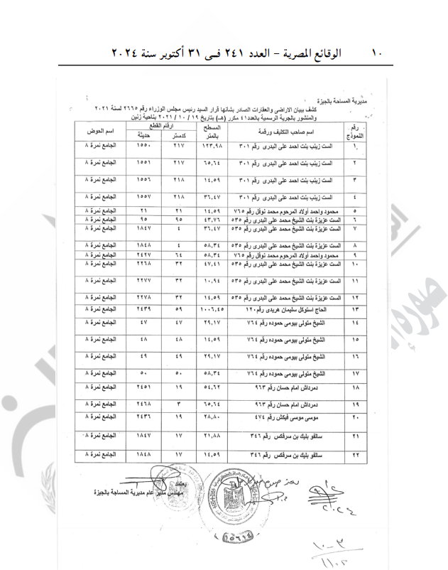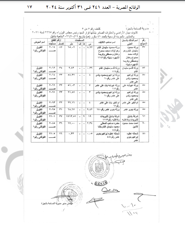 وعلى كتاب مديرية المساحة بالجيزة رقم (353) المؤرخ 7/7/2024 بشأن طلب استصدار قرار بنزع ملكية الأحواض، التي تم عرضها ولم يتم الانتهاء من إيداع النماذج الخاصة بها، مكتب الشهر العقاري المختص، وفقا لقرار رئيس مجلس الوزراء رقم 2665 لسنة 2021، وبناء على ما عرضه اللواء أ.ح مهندس رئيس الجهاز المركزى للتعمير للصالح العام.