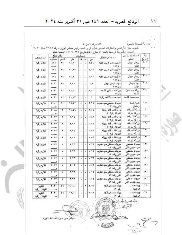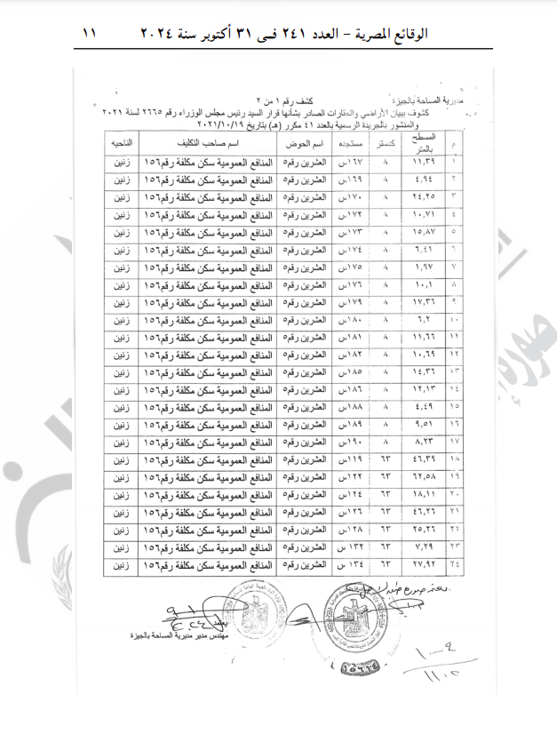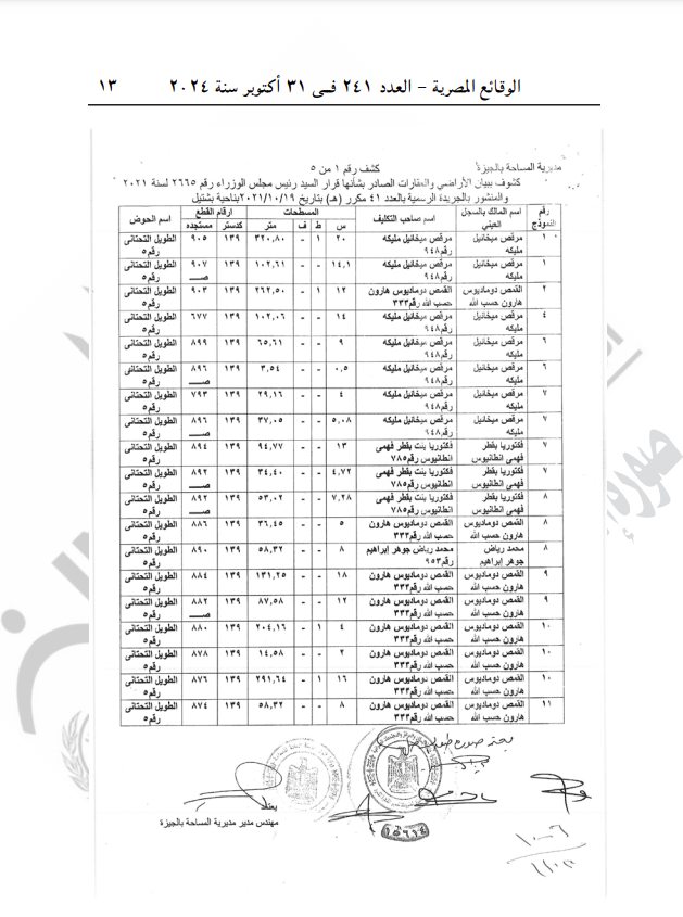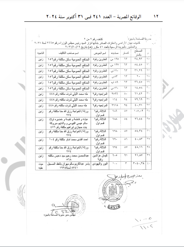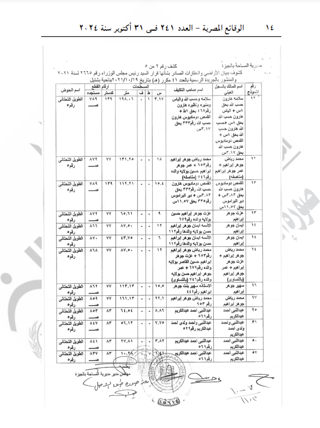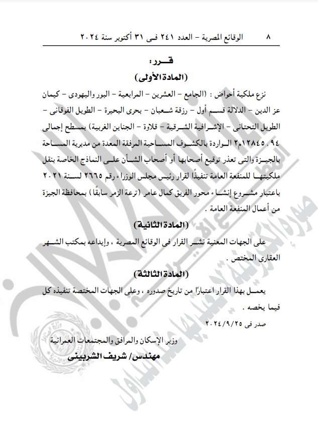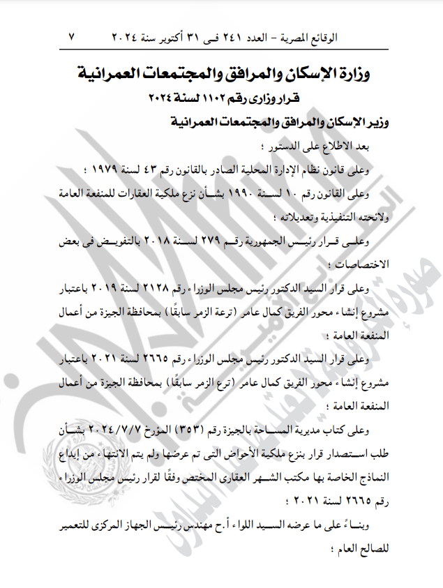 نشرت جريدة الوقائع المصرية في عددها رقم 241، الصادر اليوم في 31 أكتوبر 2024، قرار وزارة الإسكان والمرافق رقم 1102 لسنة 2024، بشأن نزع ملكية أراضٍ في الجيزة لتنفيذ مشروع محور الفريق كمال عامر.