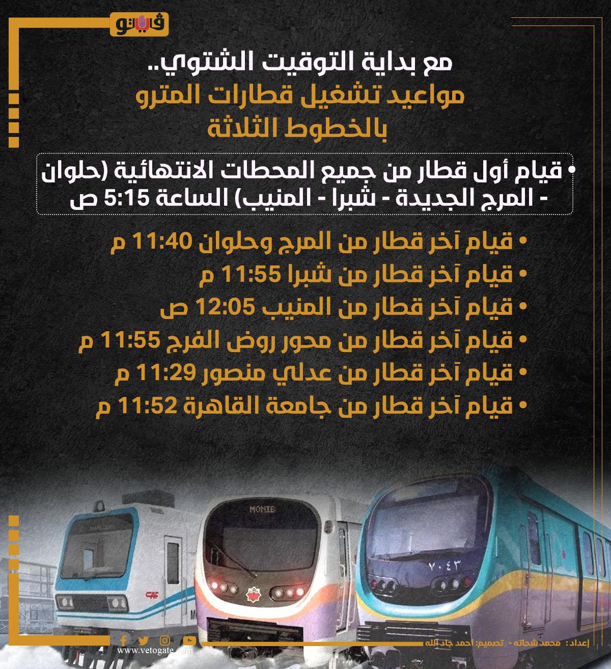 مع بداية التوقيت الشتوي.. مواعيد تشغيل قطارات المترو بالخطوط الثلاثة (إنفوجراف) الخميس 31/أكتوبر/2024 - 11:06 م 10/31/2024 11:06:49 PM مترو محمد شحاته شارك طباعة 18 حجم الخط شارك طباعة المرج الجديدة روض الفرج جامعة القاهر
