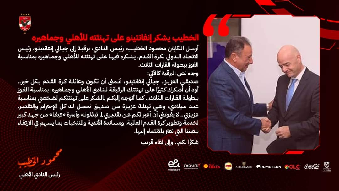 أرسل الكابتن محمود الخطيب، رئيس النادي الأهلي، برقية إلى جياني إنفانتينو، رئيس الاتحاد الدولي لكرة القدم، يشكره فيها على تهنئته للأهلي وجماهيره بمناسبة الفوز ببطولة القارات الثلاث.