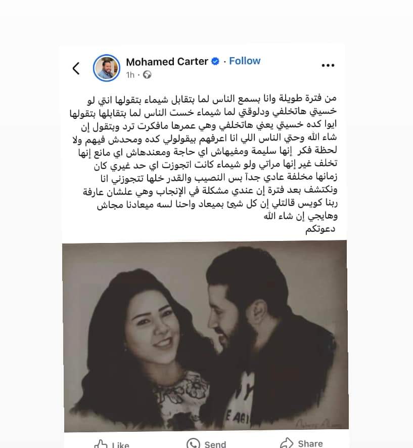 كشف المنتج محمد كارتر زوج الفنانة شيماء سيف، مفاجأة بشأن عدم إنجابها حتى الآن، عبر حسابه الخاص على موقع التواصل الاجتماعي فيس بوك.
