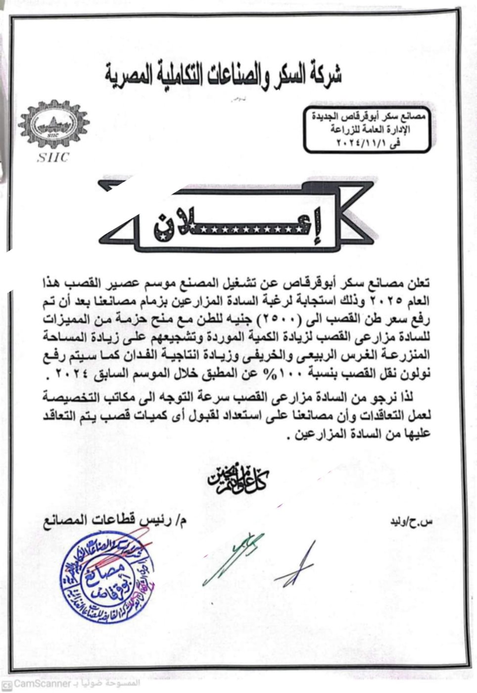أعلنت شركة السكر للصناعات التكاملية المصرية، متمثلة في مصنع سكر أبوقرقاص جنوب محافظة المنيا، تشغيل المصنع في موسم عصير القصب في هذا العام 2025 وذلك استجابة لرغبة المزارعين في زمام المصنع.