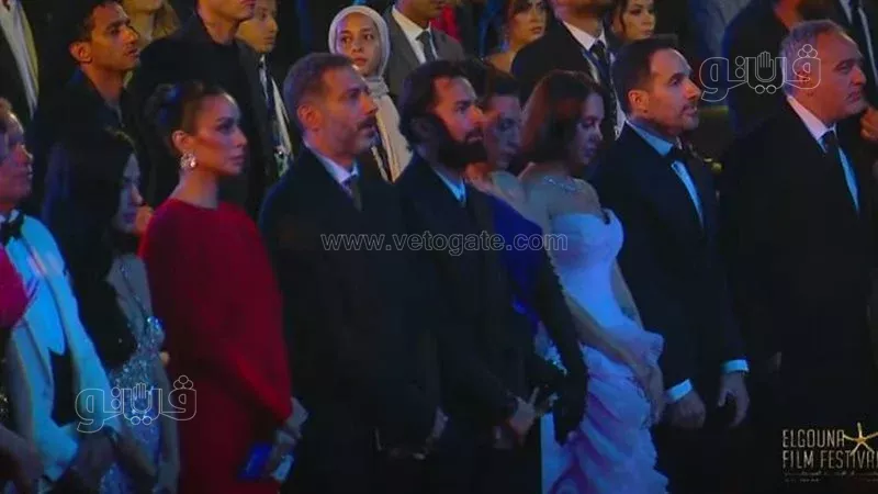 وفي بداية الحفل، حرص عدد من النجوم والنجمات على إرسال رسالة دعم للشعب الفلسطيني المقاوم، بارتداء أزياء المقاومة وفي مقدمتها الشال وشعارات النصر.