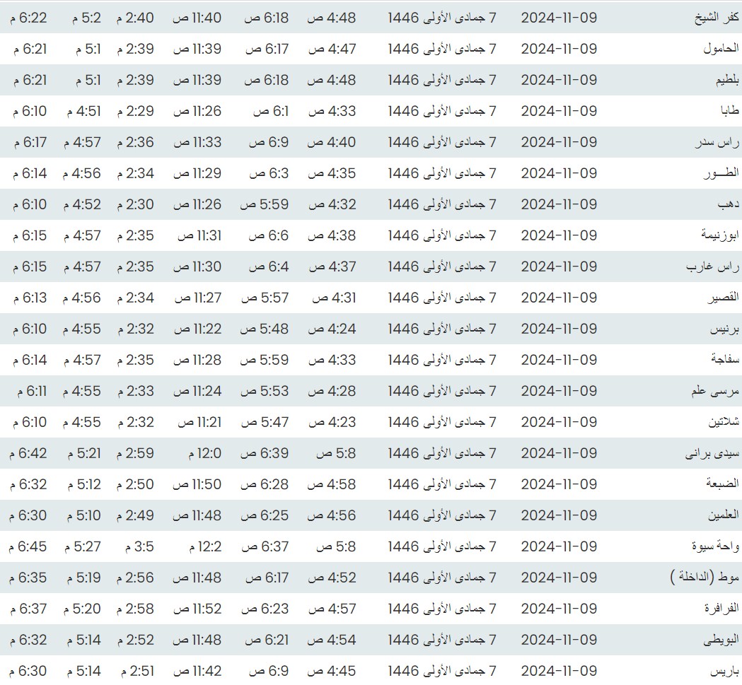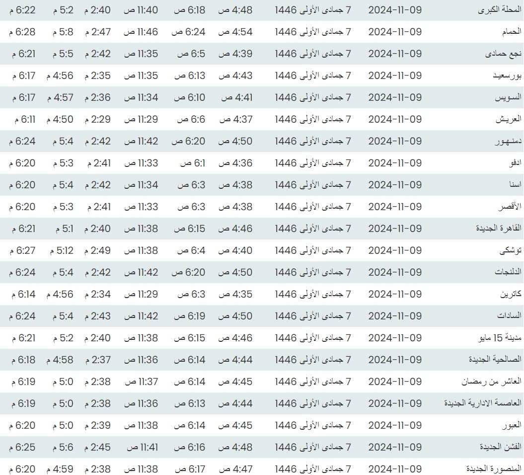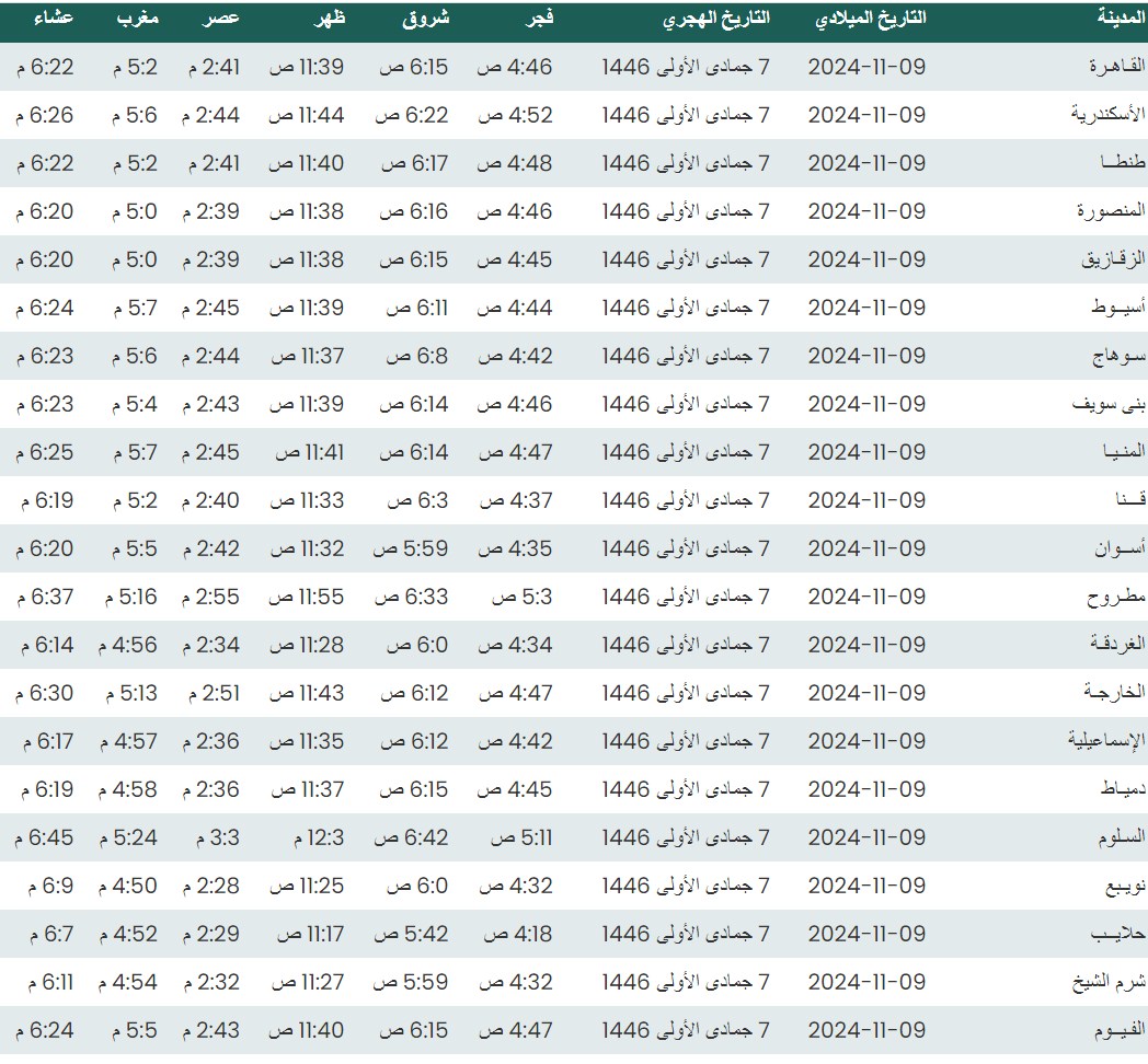 وفيما يلي مواقيت الصلاة، لعدد من مدن ومحافظات الجمهورية من واقع بيانات الهيئة العامة للمساحة