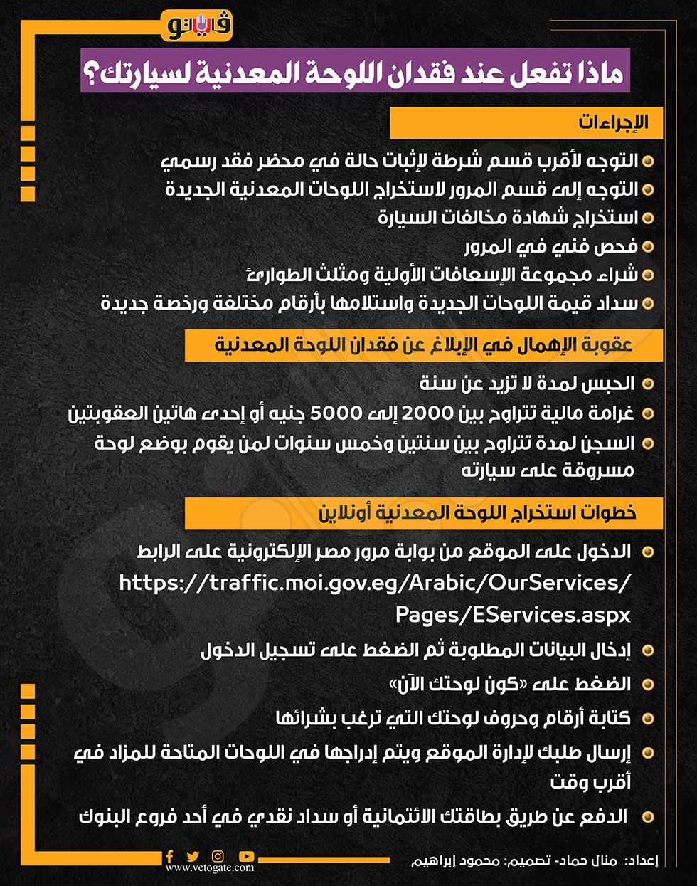 ماذا تفعل عند فقدان اللوحة المعدنية لسيارتك ؟ (انفوجراف) الأحد 03/نوفمبر/2024 - 09:50 ص 11/3/2024 9:50:56 AM خطوات الابلاغ عن اللواحات المعدنية في حال فقدانها،فيتو منال حماد شارك طباعة 18 حجم الخط شارك طباعة اللواحة المعدنية فيتو قسم شرطة اللوحات المعدنية الجديدة