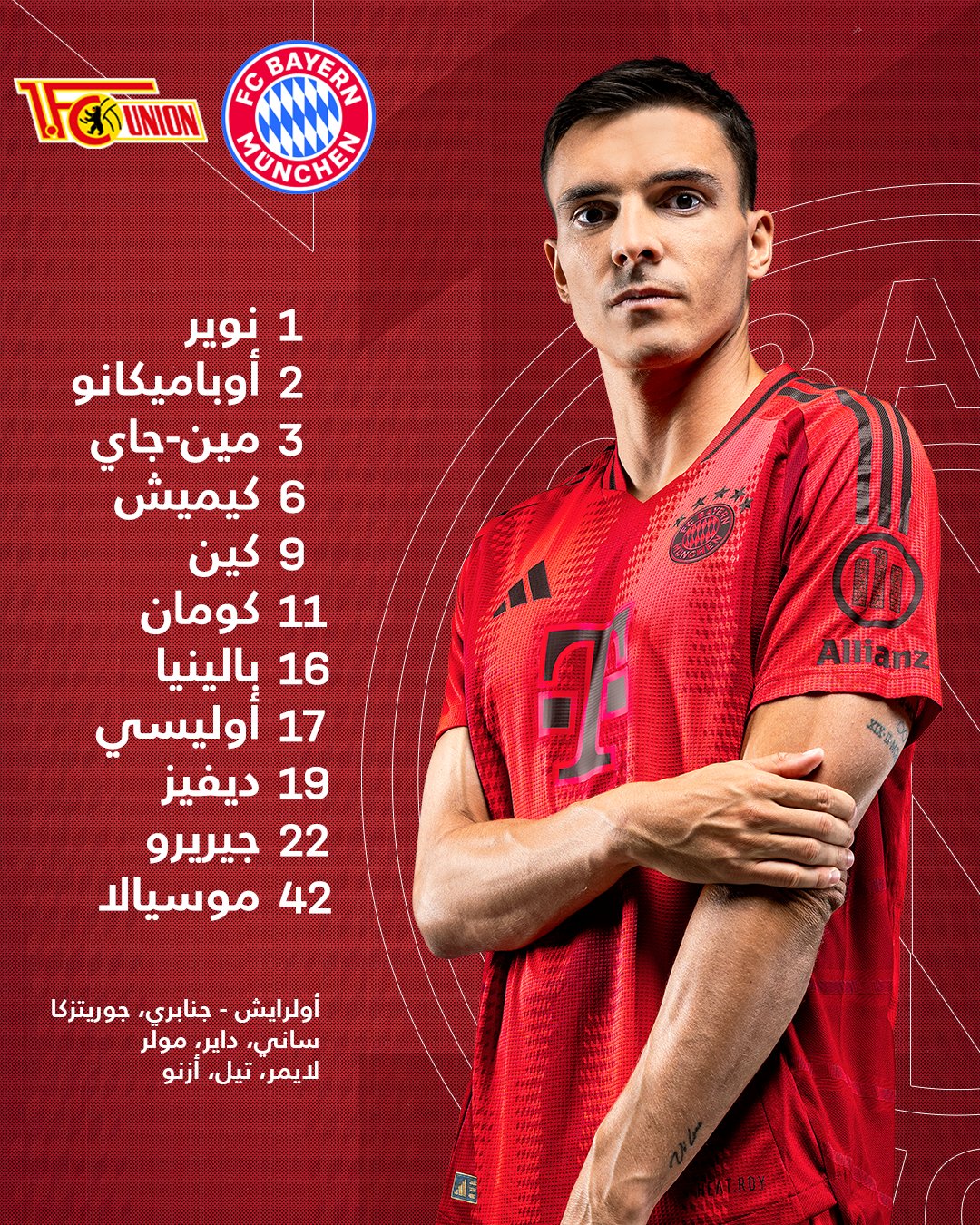 ومن المتوقع أن يدخل بايرن ميونخ اللقاء أمام يونيون برلين بتشكيل مكون من: