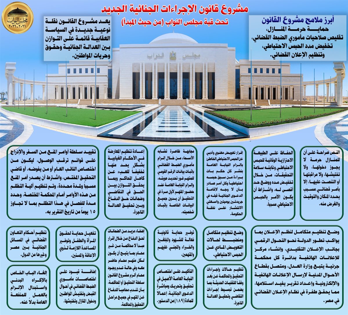 وأوضحت اللجنة التشريعية، أن مشروع قانون الإجراءات الجنائية الجديد، تضمن مزيدًا من ضمانات الحقوق والحريات للمواطن المصري بما يليق بالجمهورية الجديدة على النحو الوارد بتقرير اللجنة المشتركة بشأنه.