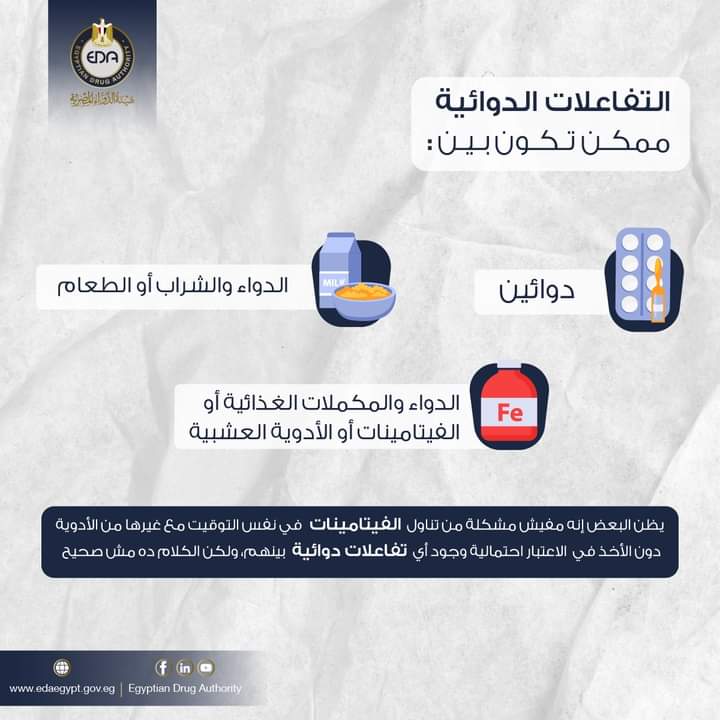 وقالت هيئة الدواء المصرية إن التفاعلات الدوائية لا تقتصر فقط على التفاعلات الدوائية بين دوائين، بل يمكن أن تكون بين الدواء والمكملات الغذائية أوالفيتامينات أو الأدوية العشبية، وبين الدواء والشراب أو الطعام.