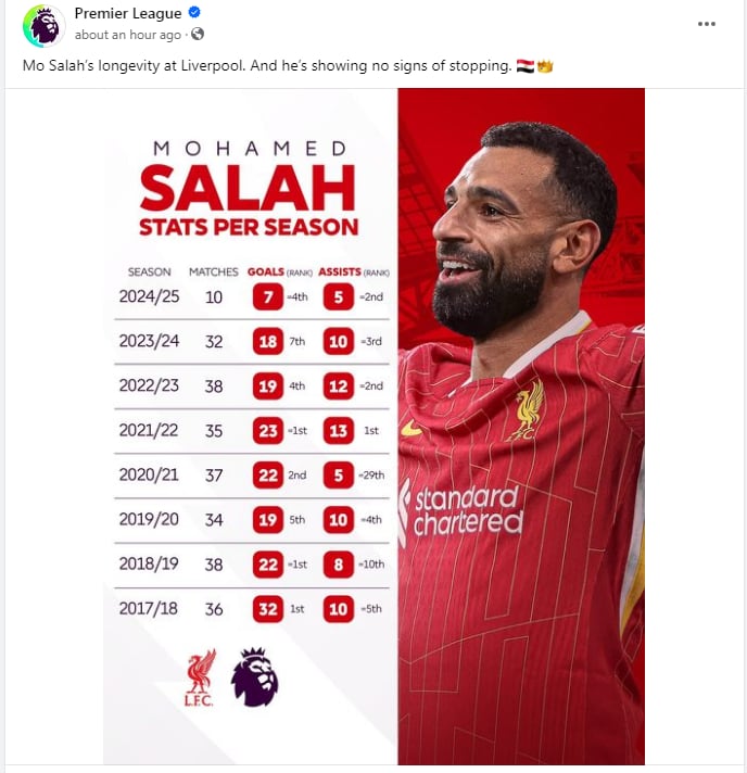 ونشر الحساب الرسمي للدوري الإنجليزي الممتاز عبر منصة "إكس": أن محمد صلاح أثبت منذ انتقاله لنادي ليفربول أنه لا يتوقف عن تسجيل الأهداف، حيث يسجل صلاح أهدافا مع الريدز في كل موسم يشارك فيه بالبريميرليج.