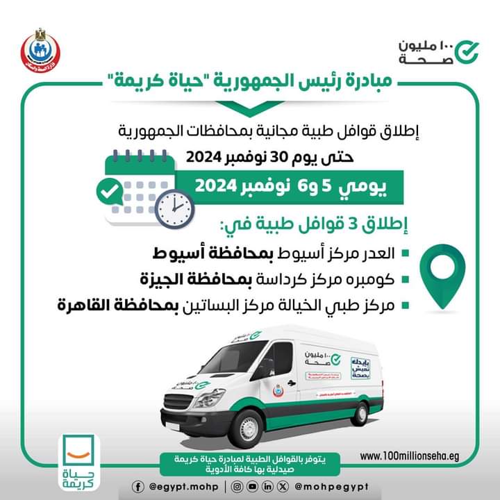 أعلنت وزارة الصحة إطلاق ٣ قوافل طبية ضمن مبادرة رئيس الجمهورية حياة كريمة يومي ٥ و٦ نوفمبر للكشف والعلاج مجانًا في التخصصات الطبية نساء وولادة - خدمات تنظيم الأسرة - الأطفال والباطنة - الأنف والأذن والعظام - الجراحة - الرمد الأسنان - القلب - الجلدية وخدمات الأشعة والتحاليل.