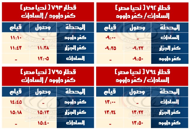 • تشغيل قطار 793: كفر داوود / السادات، حيث يقوم من محطة كفر داوود الساعة 11:10، يصل محطة السادات الساعة 12:05، بتركيب (5 عربات تحيا مصر) كالجدول المرفق.
