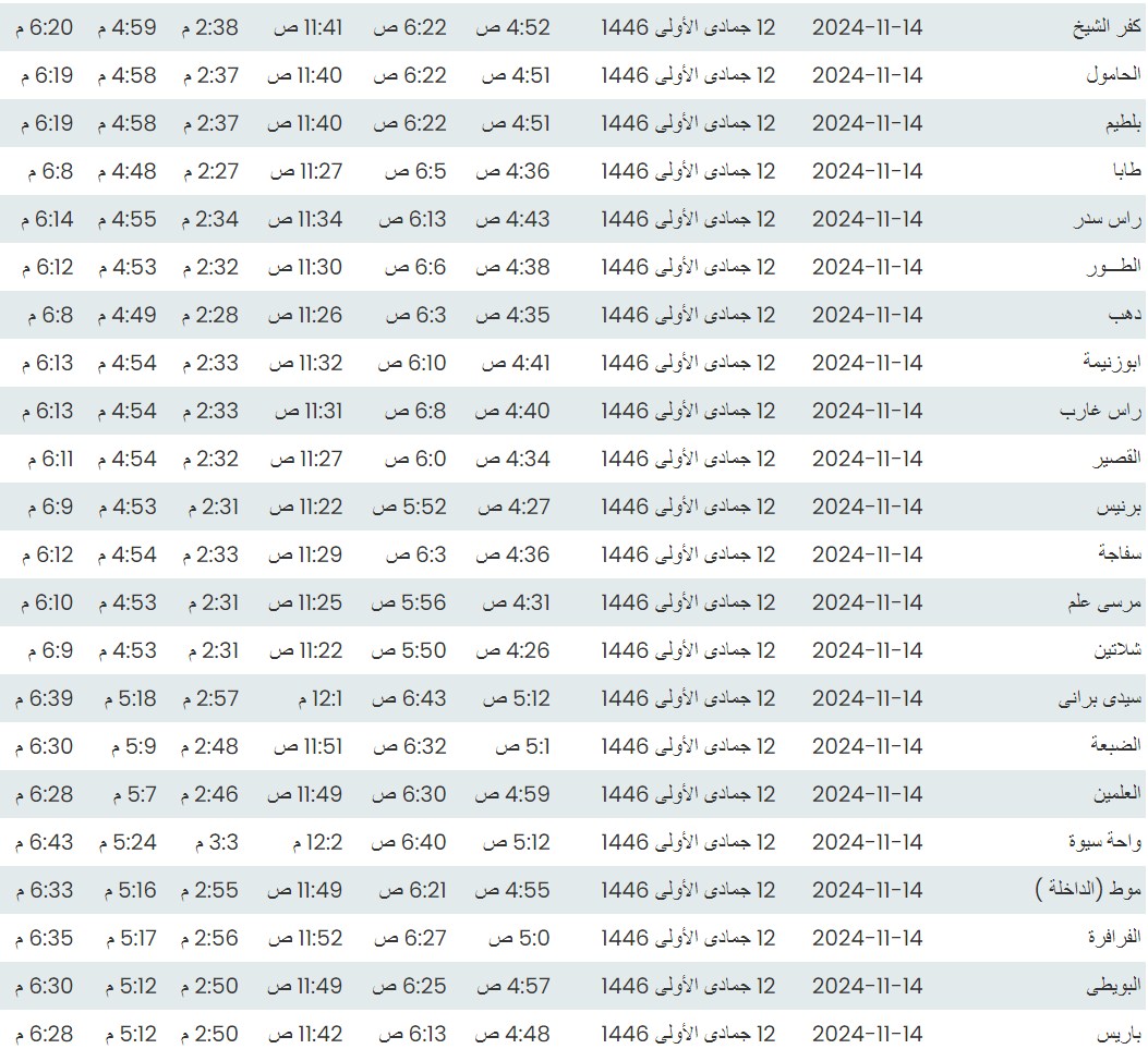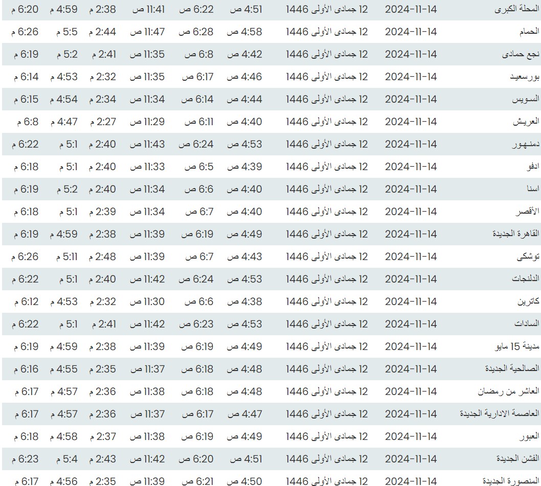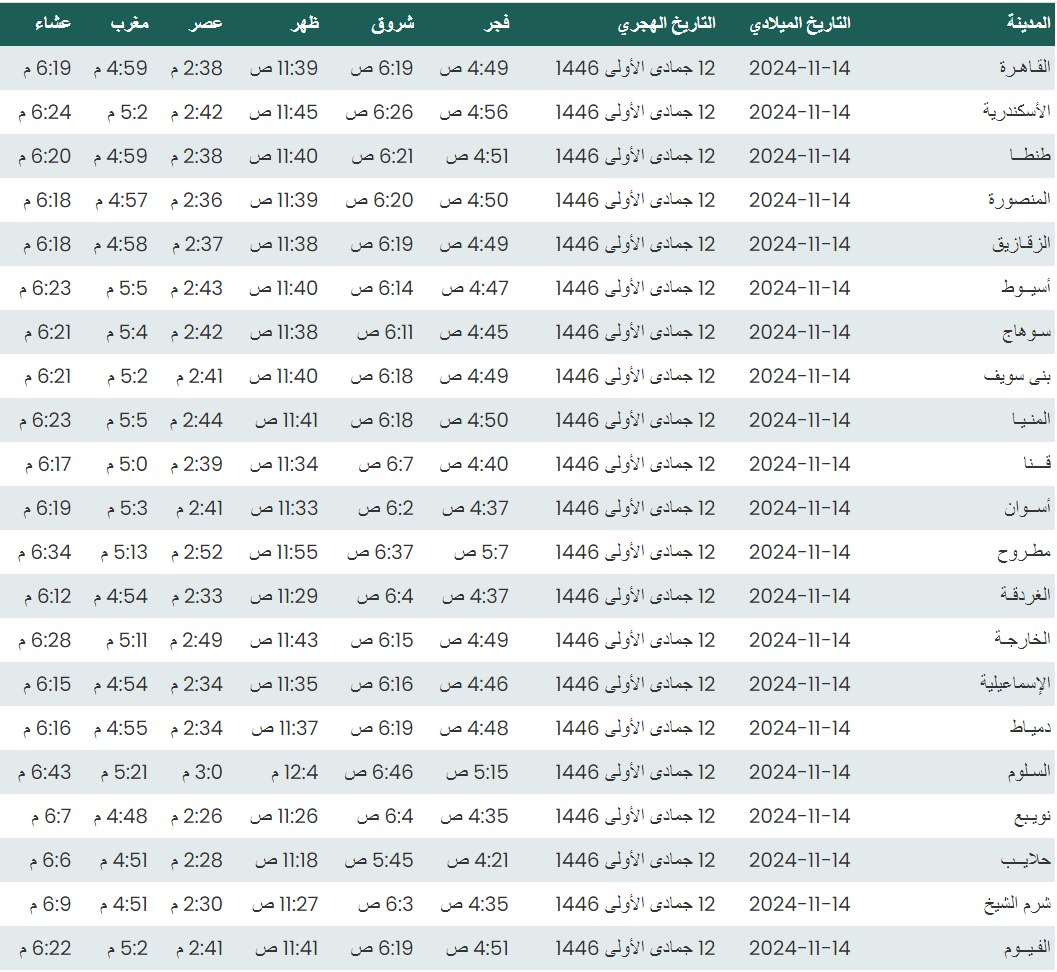 وفيما يلي مواقيت الصلاة، لعدد من مدن ومحافظات الجمهورية من واقع بيانات الهيئة العامة للمساحة