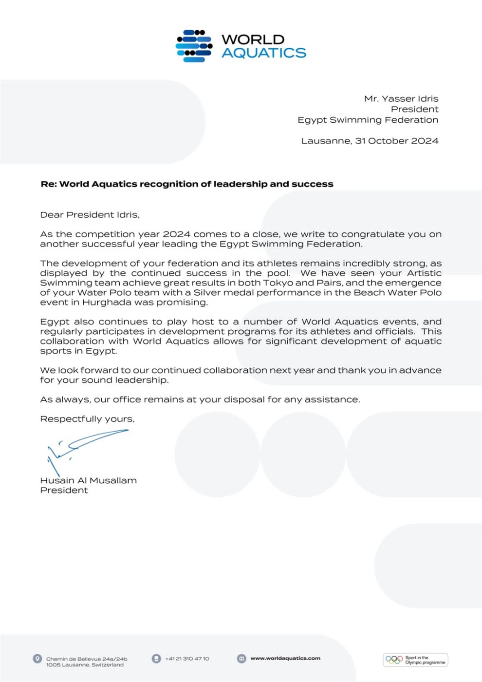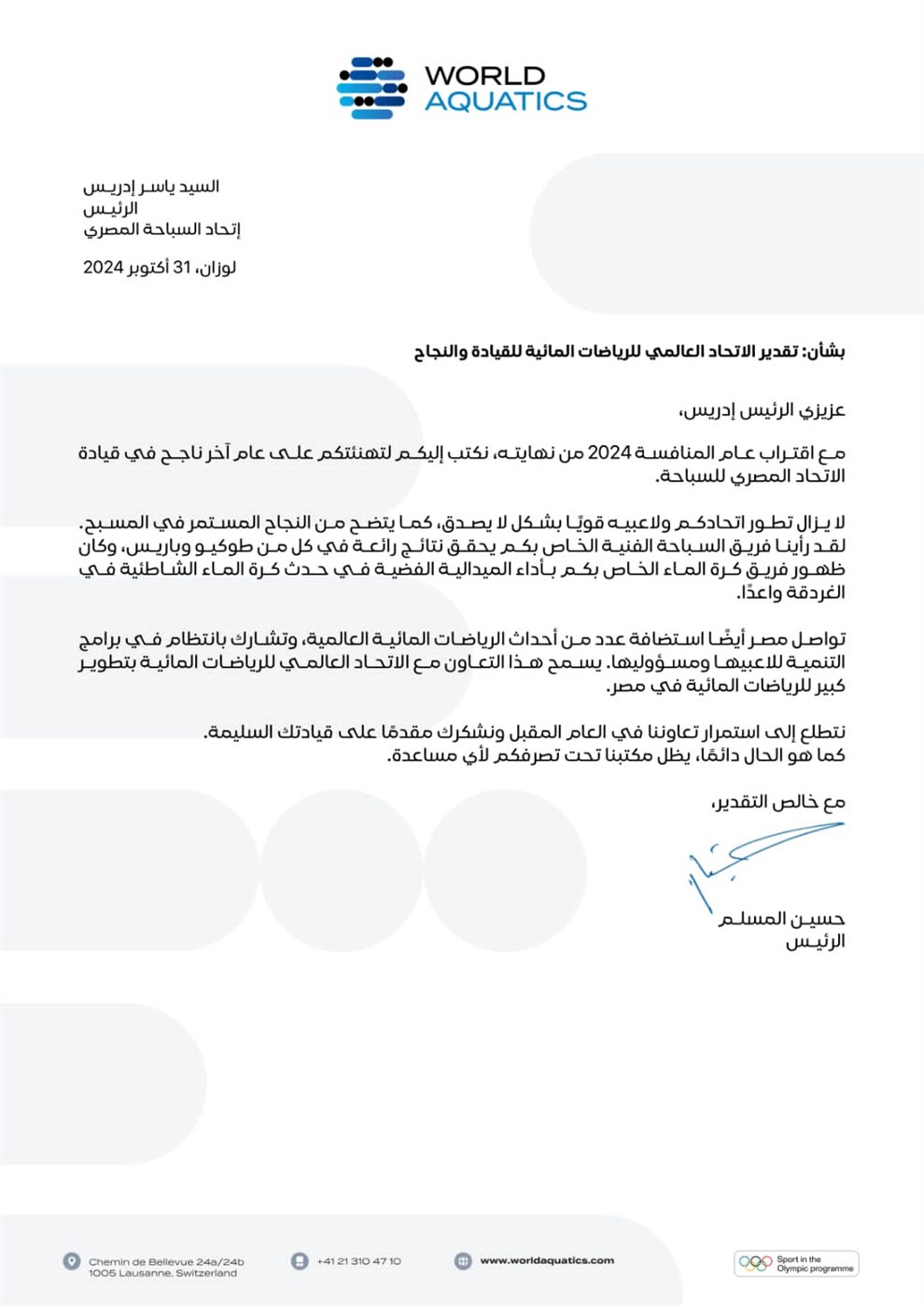 هنأ الكويتي حسين المسلم رئيس الاتحاد الدولي لألعاب الماء، المهندس ياسر إدريس رئيس اتحاد السباحة المصري رئيس اللجنة الأولمبية المصرية على عام آخر ناجح في قيادة الاتحاد المصري للسباحة، وذلك مع اقتراب انتهاء عام المنافسة 2024.