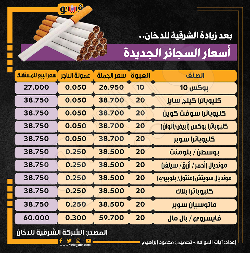 بعد زيادة الشرقية للدخان، أسعار السجائر الجديدة (إنفوجراف) الثلاثاء 05/نوفمبر/2024 - 08:29 م 11/5/2024 8:29:20 PM سعر السجائر آيات الموافى شارك طباعة 18 حجم الخط شارك طباعة سعر علبة السجائر سجائر كليوباترا كليوباترا سوفت