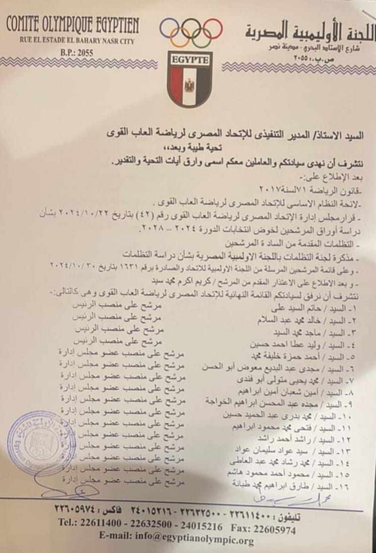 أصدرت اللجنة الأوليمبية خطابا رسميا يتضمن القائمة النهائية للمرشحين في انتخابات الاتحاد المصري لألعاب القوى.