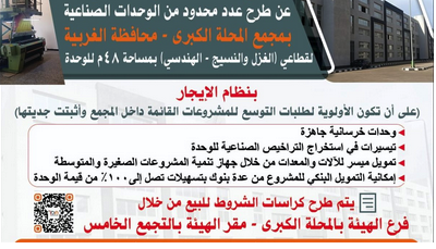 تبدأ الهيئة العامة للتنمية الصناعية طرح عدد محدود من الوحدات الصناعية الشاغرة كاملة التجهيزات بمجمع المحلة الكبرى الخرساني بمحافظة الغربية اليوم السبت.