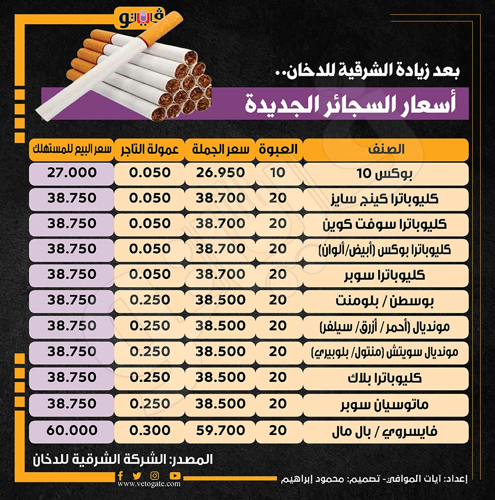 ارتفاع أسعار السجائر، شهدت أسعار السجائر الشعبية ارتفاعا مساء أمس الثلاثاء، حيث اعتمد مجلس إدارة الشركة الشرقية إيسترن كومباني، في اجتماعه، قائمة الأسعار الجديدة لجميع منتجات الشركة من سجائر كليوباترا وغيرها من الأصناف الأخرى، على أن تطبق الزيادة بدءًا من أمس الثلاثاء الموافق 5 نوفمبر 2024، وذلك لامتصاص جزء من الزيادة الحاصلة في تكلفة التصنيع نتيجة: