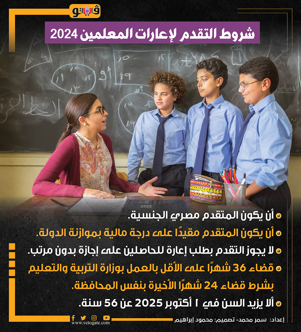 شروط التقدم لإعارات المعلمين 2024 (إنفوجراف) السبت 30/نوفمبر/2024 - 07:08 م 11/30/2024 7:08:09 PM المعلمين، فيتو سمر محمد شارك طباعة 18 حجم الخط شارك طباعة إعارات المعلمين اعارات المعلمين 2024 وزارة التربية والتعليم