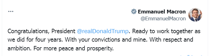 وقال الرئيس الفرنسي ماكرون: تهانينا للرئيس دونالد ترامب، على استعداد للعمل معًا كما كنا قادرين على القيام به لمدة أربع سنوات، مع قناعاتك ومع قناعاتي، مع الاحترام والطموح، لمزيد من السلام والازدهار".